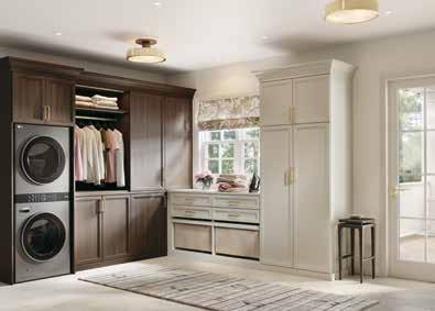DESIGN DETAILS: Classic White finish with crown molding; inset slab fronts; black hanging poles and gold knobs.