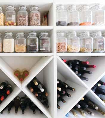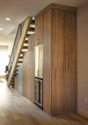 DESIGN DETAILS: A. Upper cabinet in Deep Pond finish with customer-supplied knobs. B. Understairs storage in Siena finish, featuring dedicated wine bar with aluminum frame doors with glass inserts. C. Stair-stepped wine storage in Quiet Grove. D. Compact reach-in in Linen. Opposite page: Storage in Siena finish with double-letter file drawer.
