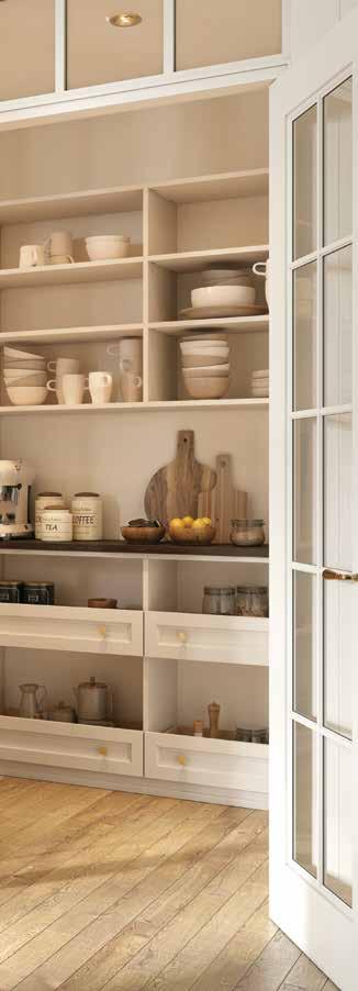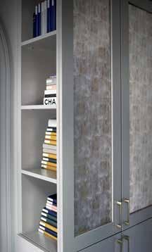 Textured glass-front doors Provides visual interest and disguises clutter Crown and base molding Lends architectural cache and dramatic effect