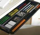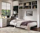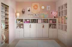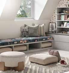A. Mini accessory drawer with crystal pull. B. Corner wrapping desk in Quiet Grove with bench seat. C. Storage bench in Grigio and Cinder finishes. D. Reach-in closet in Cinder with black hardware. Opposite page: Playroom in Misty Orchard and Morning Light finishes.