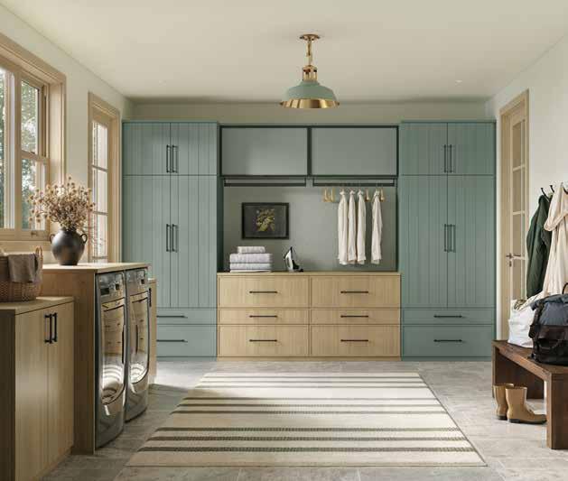 DESIGN DETAILS: A. Laundry room in Linen finish with fluted oak wood veneer fronts and black Paxton hardware. B. Mudroom with storage bench seat in Washed White with gold hooks and knobs. C. Cinder cabinetry with Desert Agave open drawers and a back-painted magnetic glass markerboard. D. Quiet Grove gardening station with trash and recycling cabinet.