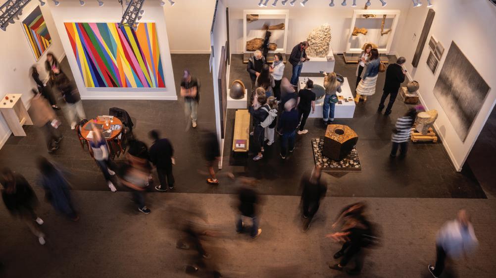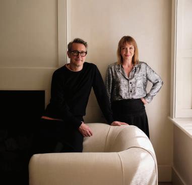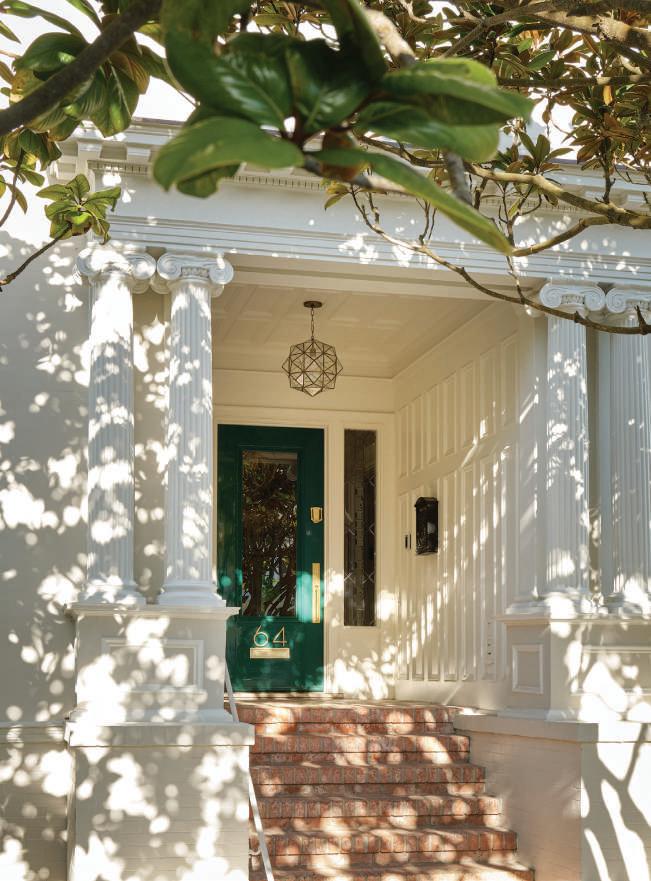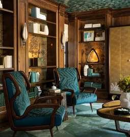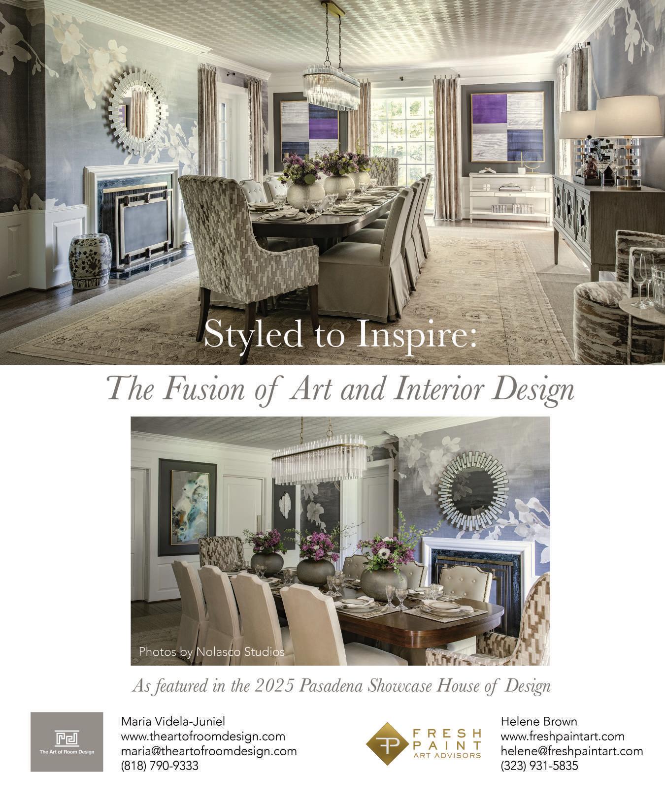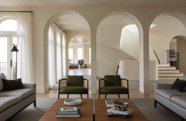 COVER For the 2025 San Francisco Decorator Showcase, interior designer Kathleen Navarra created a richly layered, wood-paneled room balanced by a ceiling swathed in Fromental’s “Rays of Plumeria” in green from HEWN. Bookshelves lined in Floral Mural and a custom Kyle Bunting hide rug complete the scheme. Gio chairs by Kimberly Denman from De Sousa Hughes are upholstered in Andes Peacock Blue by Holland & Sherry. See story beginning on page 54. Photograph by Kurt Manly.