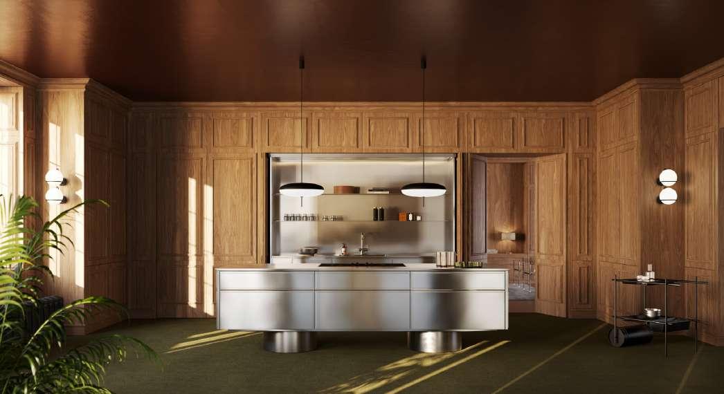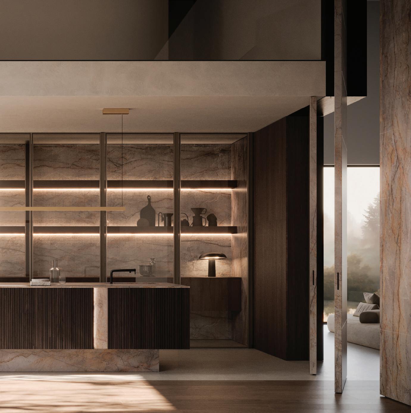 the sleek Italian-crafted kitchen by Miton Cucine. Serving as a powerful focal point, a stunning blackened steelwhite oak-and-glass staircase connects the three levels, and a fanciful Bocci chandelier further draws the eye to that vertical space.