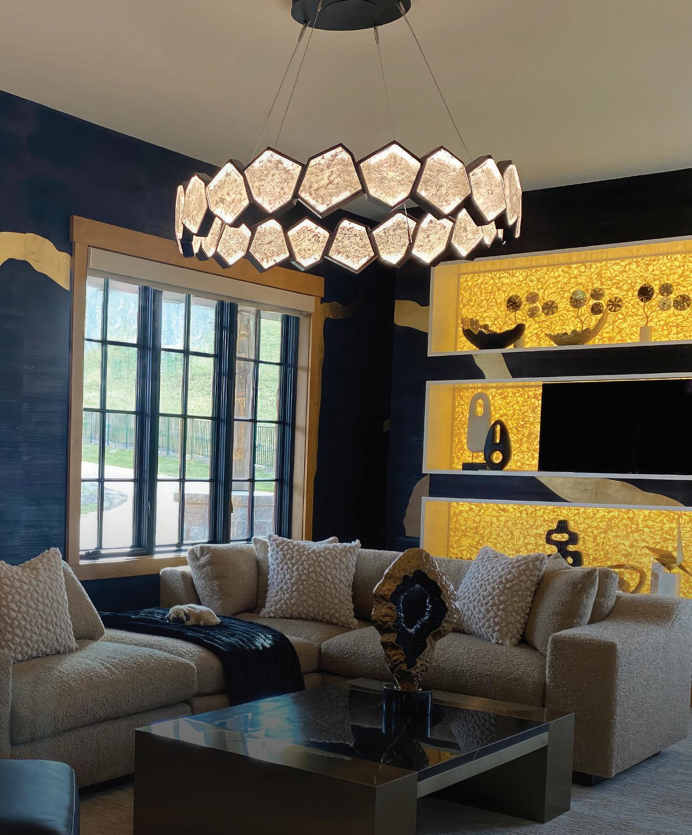 Yu conceived an open floor plan but one in which activities are divided, not by walls but unique architectural features. Past the entryway is a great room where living and dining areas are separated by an extraordinary walnutwrapped fireplace floating over a Taj Mahal quartzite-clad hearth. Yu enjoys incorporating references to the outdoors and suggests the unusual fireplace almost creates the nostalgic illusion of camping. The dining area