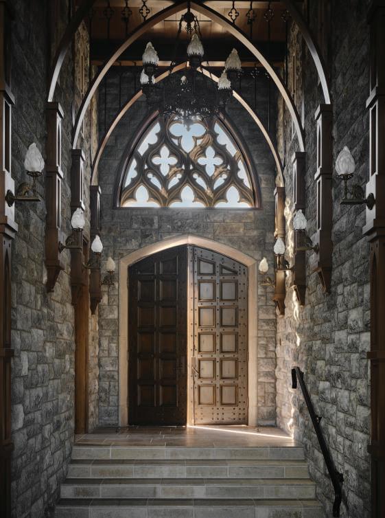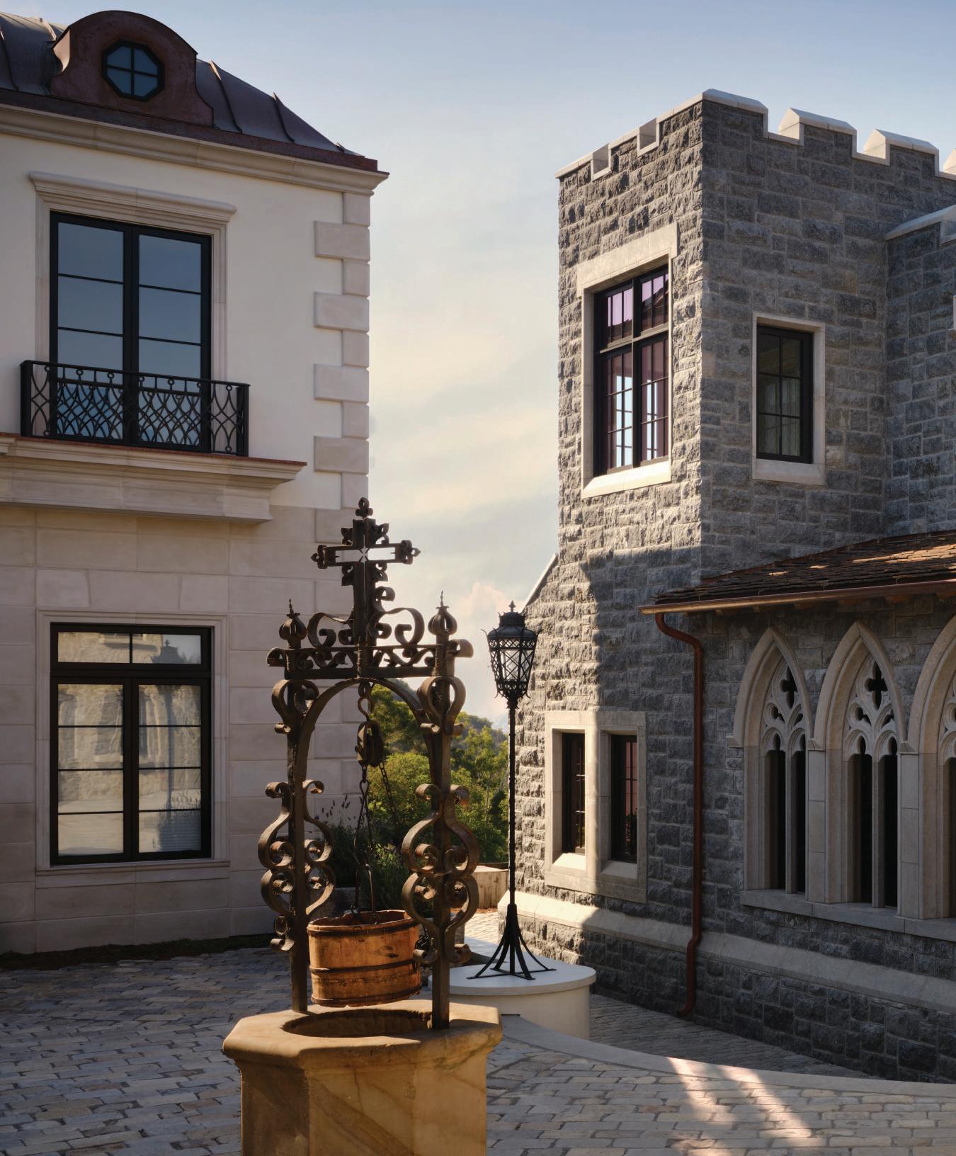 Among the materials sourced for the project were 700,000 pounds of Portuguese limestone for the castle’s façade, reports Hill, who worked with San Diego’s Unique Stone Imports to curate more than 2,500 components from artisanal stonemasons in Europe. “We shopped the world to find the right stone,” adds IS Architecture’s Stiegler, whose firm is noted for its meticulous approach to architectural heritage. IS associate principal Joseph M. Reid explains, “Every single stone—the pattern, size and weight—was customdesigned in our studio, cut and hand-finished at a Portuguese quarry.”