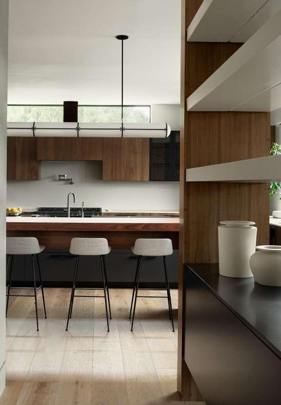 For the open, gathering spaces, the palette is light and bright. In the kitchen, walls disappear, allowing the space to flow from indoors out. “We are famous for pocketing our exterior doors; this time we also hid the windows in our wall pockets to make the kitchen counter a pass-through experience when entertaining,” Gerwin says. “The juxtaposition of the heavy timber next to the delicate steel and glass doors creates a rustic, richly textured material palette, executed in a crisp, contemporary manner of detailing.”