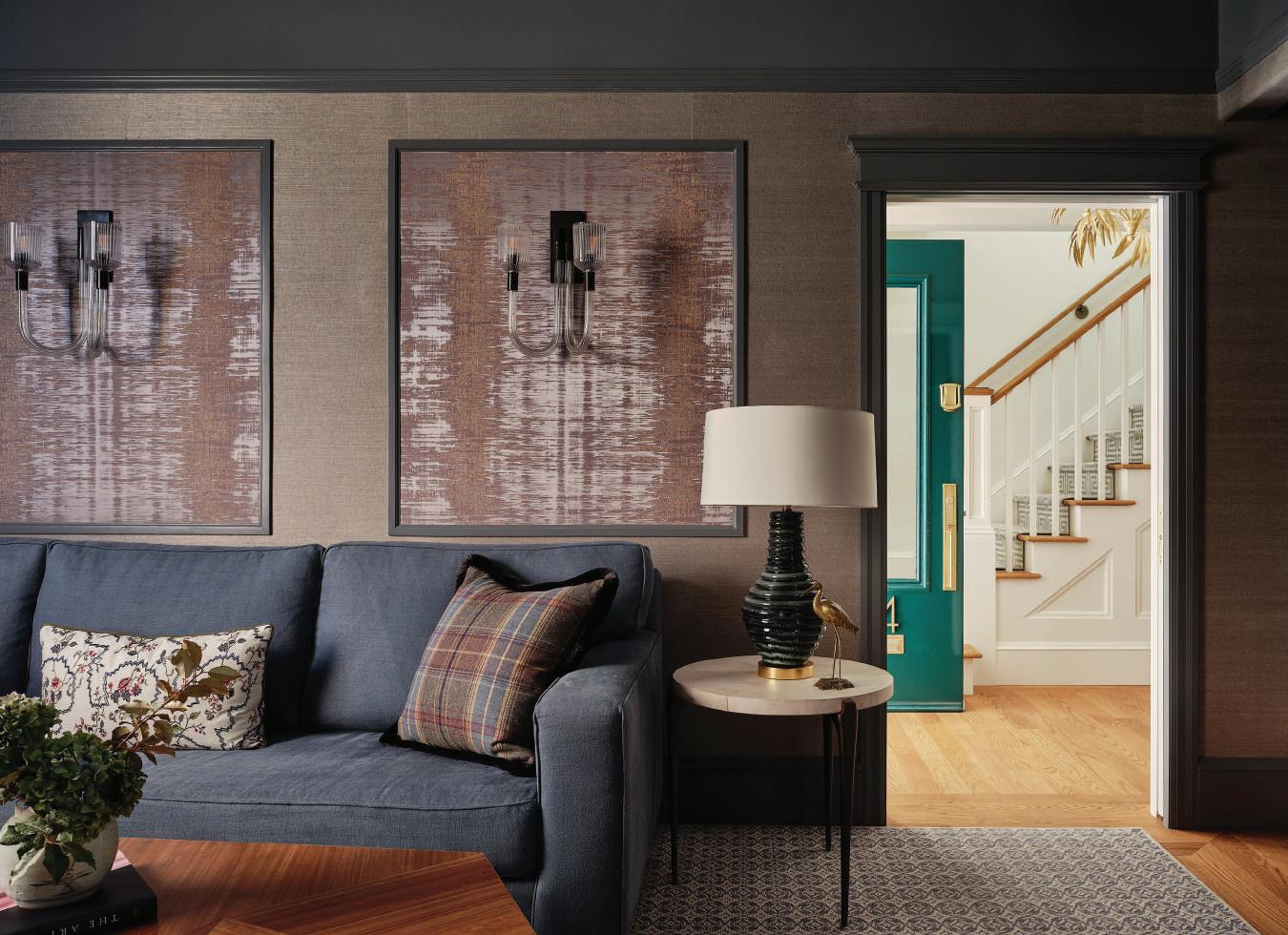 wall paneling. Elsewhere on the main level, color and texture permeate a handsome den, with Benjamin Moore’s Steel Wool on the ceiling and trim along with a Phillip Jeffries grasscloth covering the walls.