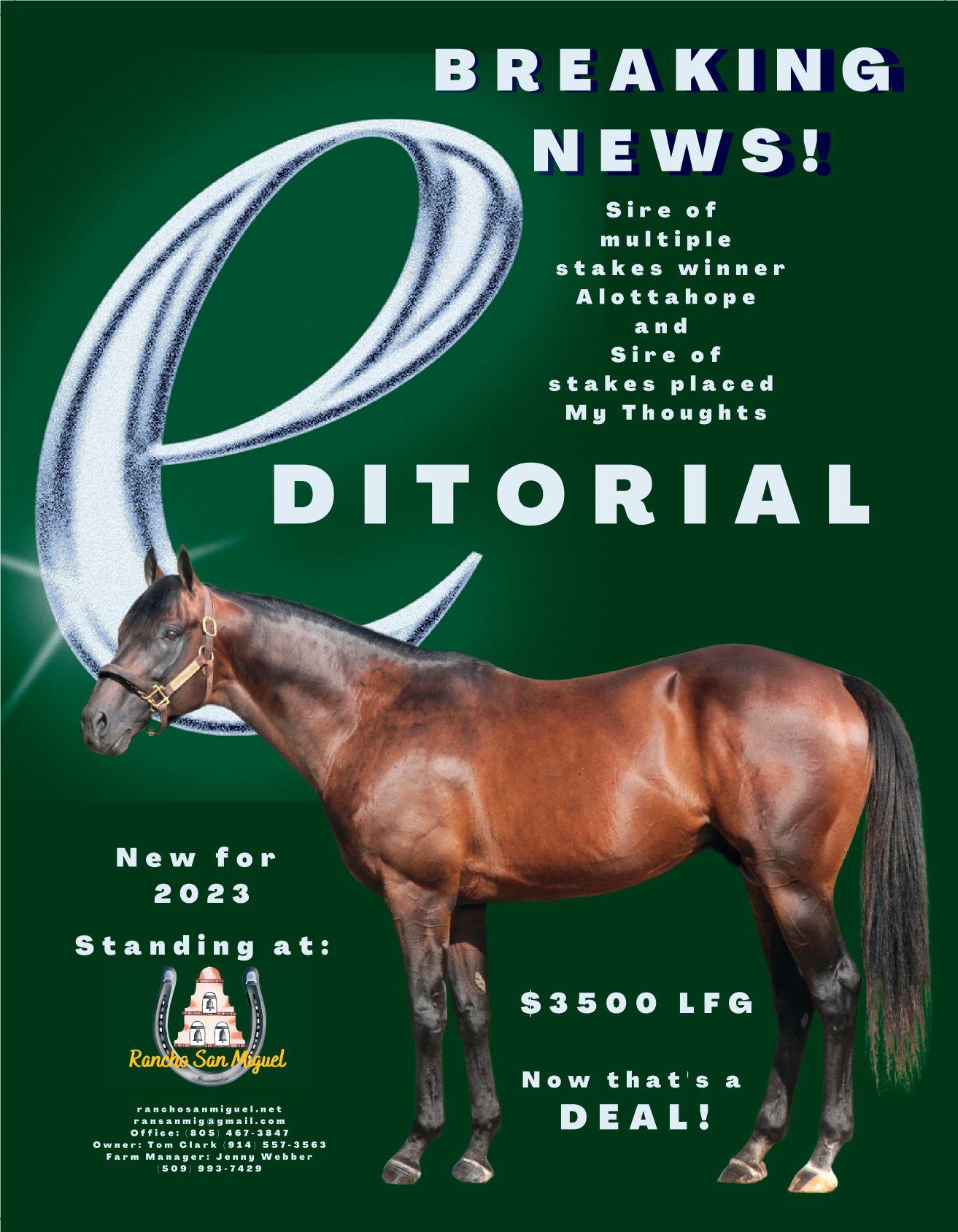 Publication of any material originating herein is expressly forbidden without frst obtaining written permission from California Thoroughbred. All advertising copy is submitted subject to approval. We reserve the right to reject any copy that is misleading or that does not meet with the standards set by the publication.