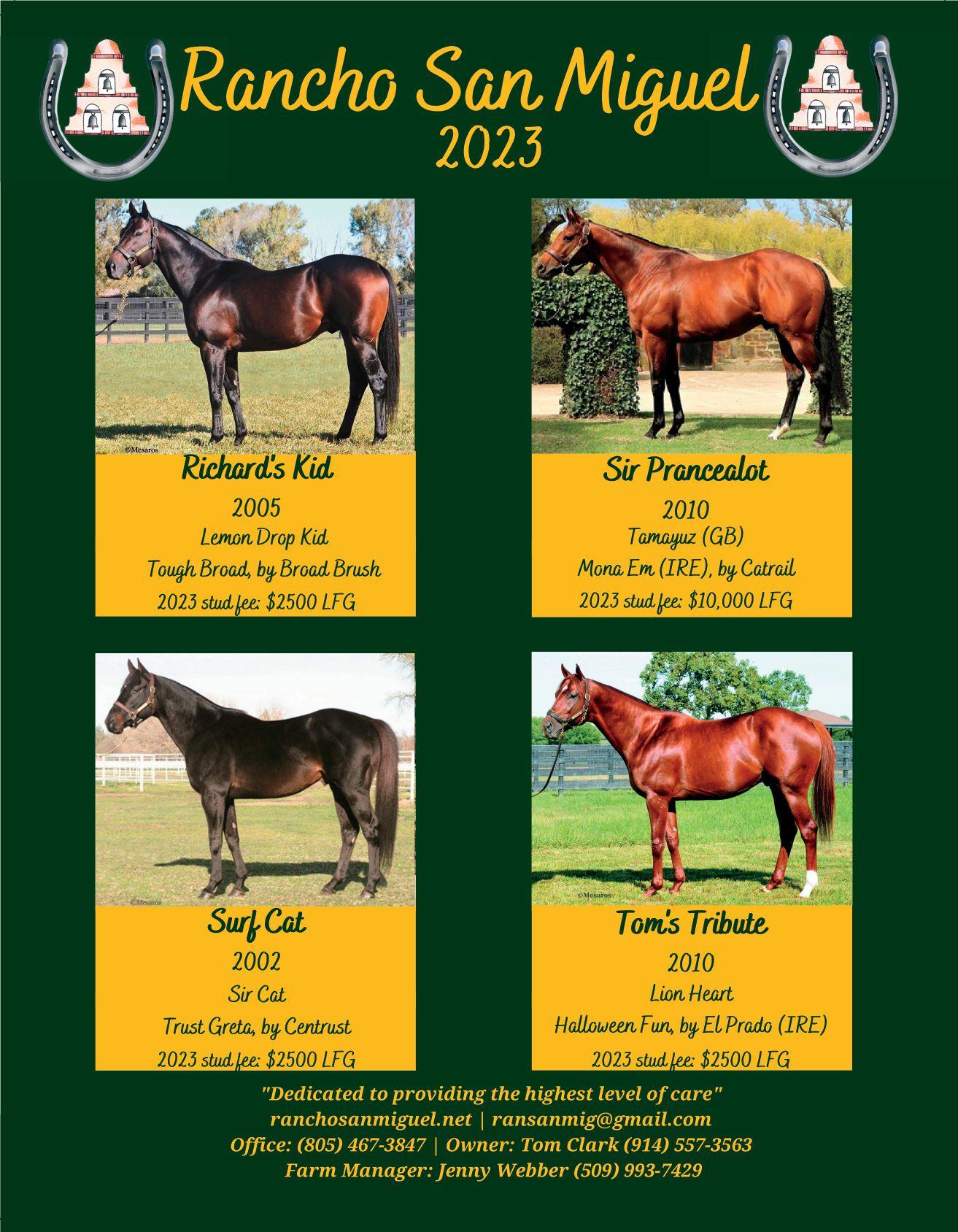 Bernardini - Marozia, by Storm Bird 2023 Fee: $15,000 LFSN Accepting limited number of mares & all mares will be screened West Coast Leading Sire by Progeny Earnings & Leading sire of 2-Year-Olds by Money Won Lifetime progeny earnings are in excess of $28.2 Million with average earnings of $71,756. STAY THIRSTY Stay Thirsty - My Fiona, by Ghostzapper 2023 Fee: $5,000 LFSN Special Consideration to Approved Mares, Early Discounted Bookings Available TWO-YEAR OLD CALIFORNIA CHAMPION OF 2021 Stakes winning two-year-old and Winner of $328,216 By Five Time Leading California Sire and Multiple G1SW STAY THIRSTY FINNEUS Union Rags - One Smokin’ Lady, by Smoke Glacken 2023 Fee: $5,000 LFSN 2022 Leading West Coast 1st Crop Sire. The Only Son of Leading sire UNION RAGS to stand in California. A good investment if breeding to run or sell. The progeny of SMOKEM were in demand at the Fasig-Tipton California September Sale. SMOKEM TERRY LOVINGIER - Cell (562) 547 9848 or email terry@lovco.com | 35490 Highway 79, Warner Springs, CA 92086 | www.lovacres.com ALSO STANDING: Grace Upon Grace, Govenor Charlie, Phantom Boss NEW FOR 2023