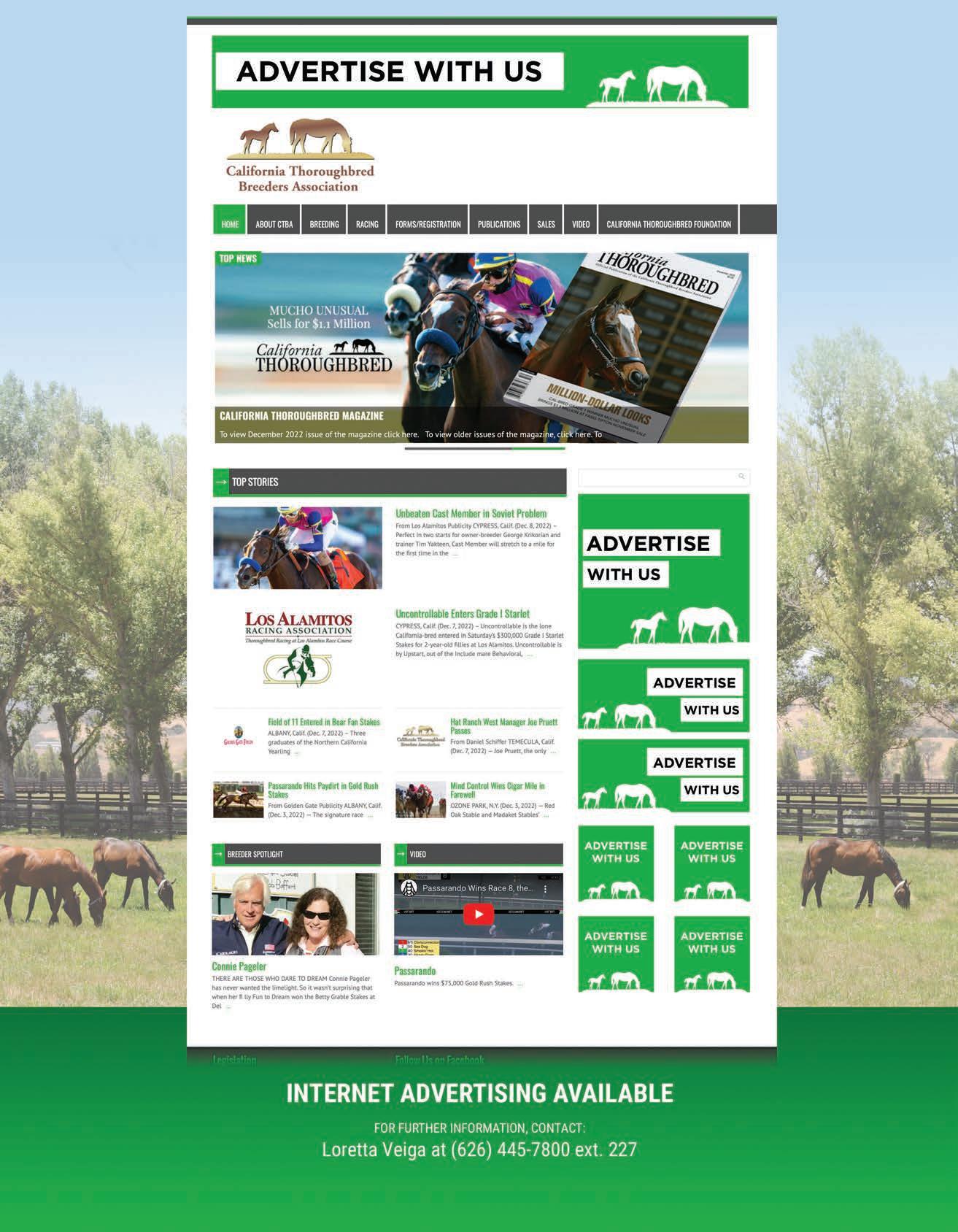 Opinions expressed in signed articles are those of the authors and do not necessarily reflect policies of the CTBA or this magazine. Publication of any material originating herein is expressly forbidden without first obtaining written permission from California Thoroughbred. All advertising copy is submitted subject to approval. We reserve the right to reject any copy that is misleading or that does not meet with the standards set by the publication.