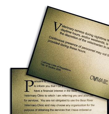 California Veterinarian (ISSN 00081612) is published bi-monthly by the California Veterinary Medical Association, e-mail: staff@cvma.net. California Veterinarian is an official publication of the California Veterinary Medical Association. Annual subscription rates to non-members: $50 U.S., $60 Canada/Mexico, $70 overseas. Price per single copy: $10 current year, $12 back issues. Periodicals postage paid at Sacramento, CA and at additional mailing offices.
