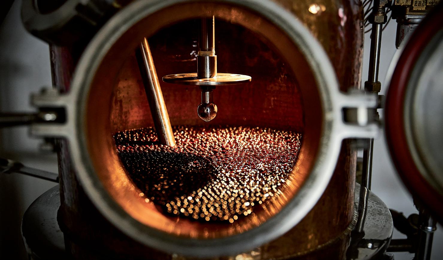 Die Methode ist weniger verbreitet. Die Perkolation wird auch als Dampfextraktion bezeichnet. Weil die Botanicals in einen sogenannten Geistkorb (Botanical-Tray) mit Siebeinsatz gefüllt wer den, der über der Brennblase in den Geisthelm eingehängt wird. Das Besondere dabei: Diese Botanicals kommen nicht mit dem flüssigen Alkohol in Berührung, nur mit den Alkoholdämpfen, und werden so aromatisiert. Eine Art Sanftgaren. Dadurch ergeben sich besonders feine Noten. Manche Gin-Hersteller kombinieren auch gern die Mazeration und die Perkolation-Methode miteinander.