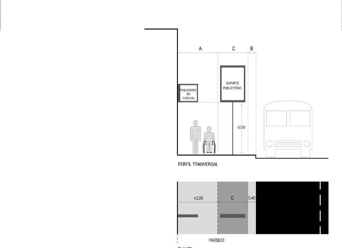 A instalação de placas toponímicas com suporte próprio, deve ser feita de acordo com o estipulado no Regulamento de Ocupação e Utilização do Espaço Público (ver esquema ao lado), deixando um corredor livre para circulação pedonal não inferior a 2,00m e uma distância mínima de 0,40m ao lancil, (para o caso, em vez de suporte publicitário, deve considera se placa toponímica com suporte próprio).