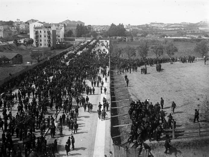 Panorâmica sobre a Calçada da Ajuda, vê-se o Palácio Nacional da Ajuda (data n.e., Eduardo Portugal, Arquivo Municipal de Lisboa – Arquivo Fotográfico, Código de referência PT/AMLSB/POR/059748) | Panoramic view of Calçada da Ajuda depicting the Ajuda National Palace (date unknown, Eduardo Portugal, Lisbon Municipal Archive - Photographic Archive, Reference code PT/ AMLSB/POR/059748)