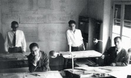 ◊ Atelier da Rua da Alegria, ao fundo Nuno Teotónio Pereira e Bartolomeu da Costa Cabral, e na frente José Maia Santos e António Pinto de Freitas, s/ data. Tostões, A. (Coord.). (2004), p. 45.