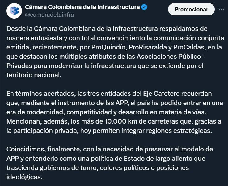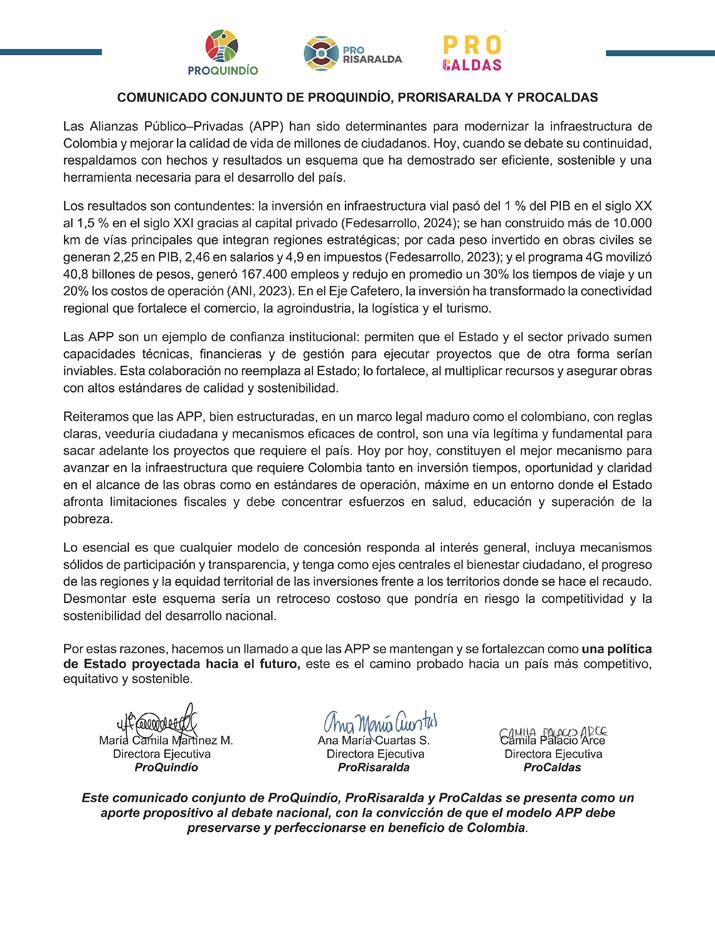 El pasado 4 de septiembre, la Cámara Colombiana de la Infraestructura a través de su cuenta de X, respaldó la comunicación conjunta emitida, recientemente, por ProQuindío, ProRisaralda y ProCaldas, en la que destacan los múltiples atributos de las Asociaciones Público-Privadas para modernizar la infraestructura que se extiende por el territorio nacional. En términos acertados, las tres entidades del Eje Cafetero recuerdan que, mediante