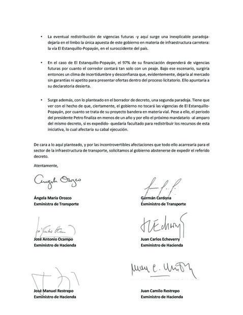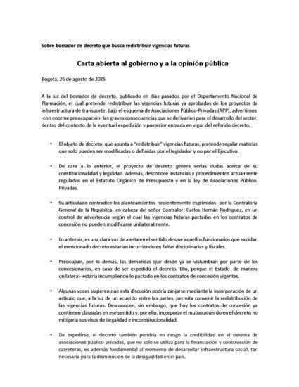 En el marco de la estrategia de comunicaciones, el 25 de agosto se adelantaron acciones para difundir y posicionar una carta oficial firmada por los exministros de Transporte, Ángela María Orozco y Germán Cardona, y de Hacienda, José Antonio Ocampo, Juan Carlos Echeverry, José Manuel Restrepo y Juan Camilo Restrepo, en la que se advirtió sobre los riesgos para la infraestructura de transporte derivados de la redistribución de vigencias futuras en proyectos APP, propuesta en un borrador de decreto del Departamento Nacional de Planeación.