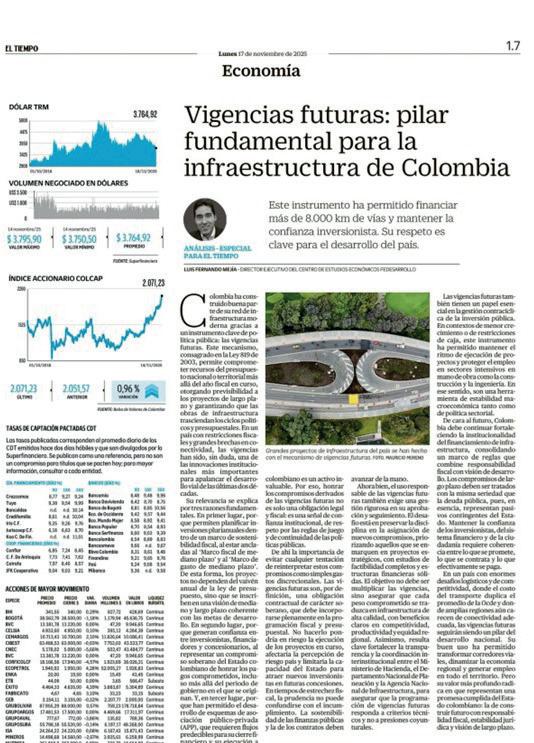 La CCI impulsó dos publicaciones estratégicas en el diario El Tiempo, orientadas a respaldar el esquema de financiación de la infraestructura. Una de ellas fue ‘De concesiones y vigencias futuras’, en la que el presidente de la CCI defendió el modelo concesional y su pertinencia para el desarrollo vial del país. A este mensaje se sumó la difusión de la nota ‘Vigencias futuras: pilar fundamental para la infraestructura de Colombia’, un análisis realizado por Luis Fernando Mejía, que resaltó el papel de este instrumento en la financiación de más de 8.000 kilómetros de vías y en el mantenimiento de la confianza inversionista. Con estos contenidos, la CCI buscó incidir en la opinión pública y reforzar la relevancia de la planeación de largo plazo.