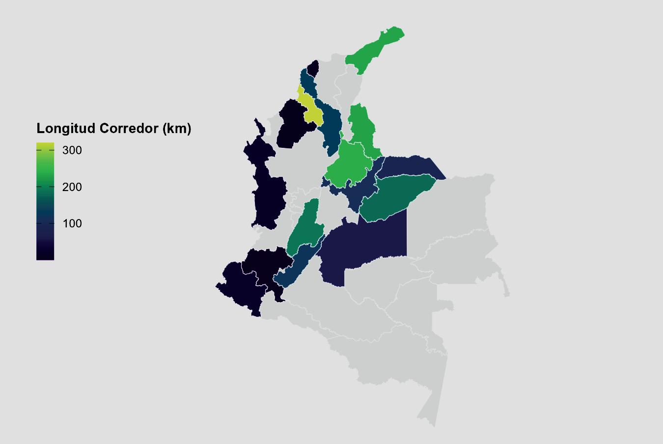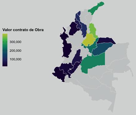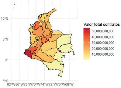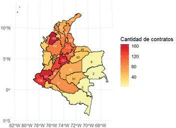 En contraste, departamentos como Vichada (6), Amazonas (5), Vaupés (5) y Guainía (2) registran un número mínimo de contratos, evidenciando la baja cobertura en la Amazonía colombiana.