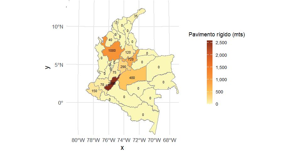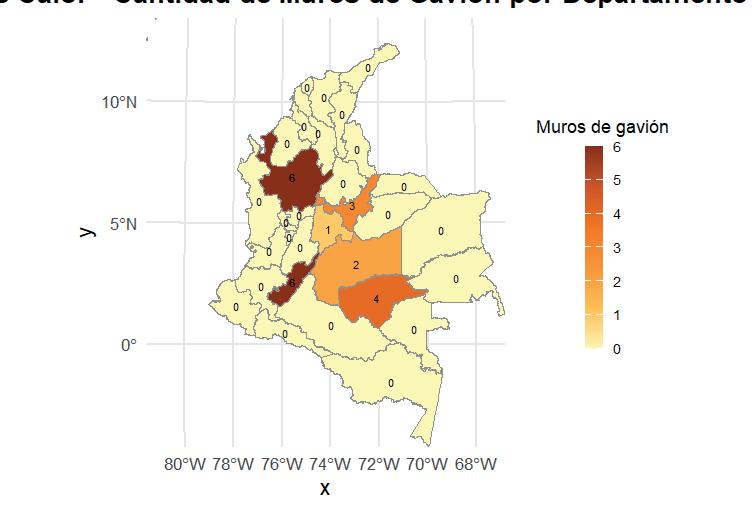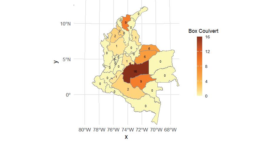 En el mismo periodo se reporta la construcción de 56 box culvert y 22 muros en gavión, distribuidos también de forma muy heterogénea. Los box culvert se concentran en Meta (16), Guaviare (9), Casanare (6), Magdalena (9), Caquetá (2) y Sucre (2), con registros menores en Huila, Antioquia, Cundinamarca, Norte de Santander y Bolívar (1 en cada uno). En cuanto a los muros en gavión, los mayores valores corresponden a Antioquia (6), Casanare (6), Guaviare (4), Meta (2) y Magdalena (9), sin registros en la mayoría de los demás departamentos.