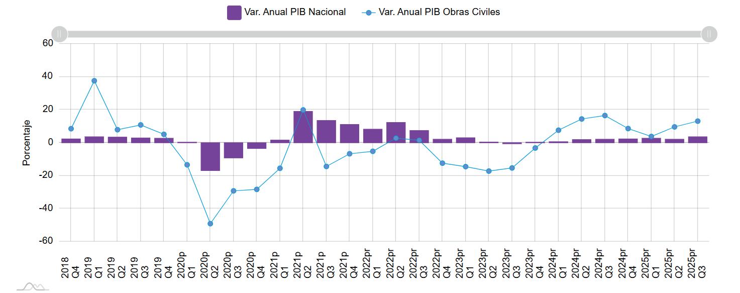 En el tercer trimestre de 2025, el PIB nacional creció 3,6% respecto al mismo periodo de 2024. En el caso específico del PIB del subsector de obras civiles, este registró un crecimiento de 13,1%.