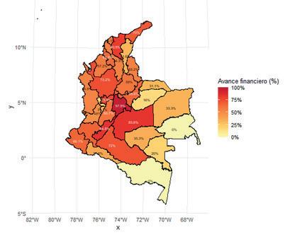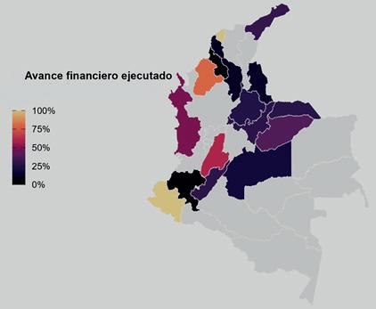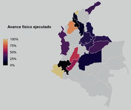 Con corte a 30 de junio de 2025, el promedio de avance físico ejecutado es 40 %, con resultados heterogéneos entre departamentos. Destacan los proyectos de Atlántico y Nariño (100 %), Córdoba (87 %) y Tolima (63 %), mientras que los de Sucre (3 %), Cauca (3 %) y Bolívar (13 %) presentan los niveles más bajos.