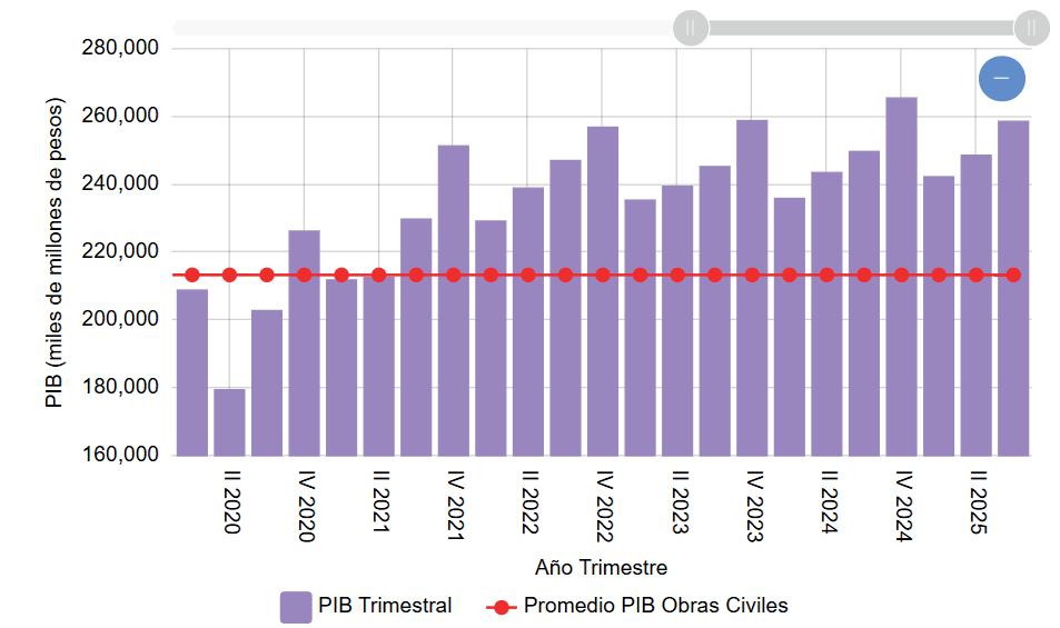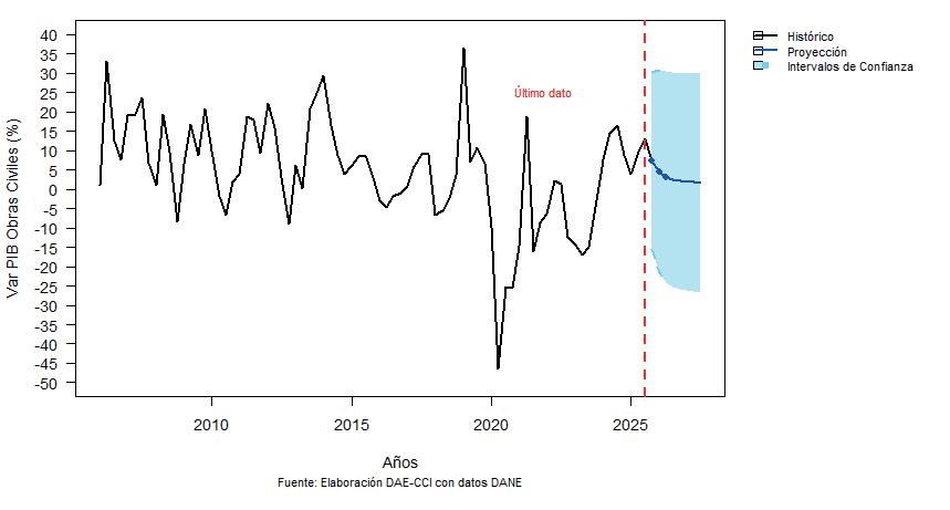 Para el cuarto trimestre de 2025 el PIB de obras civiles se proyecta un crecimiento del 7,4%, mientras que para el primer trimestre del 2026 se prevé que dicho indicador crezca 4,5%.