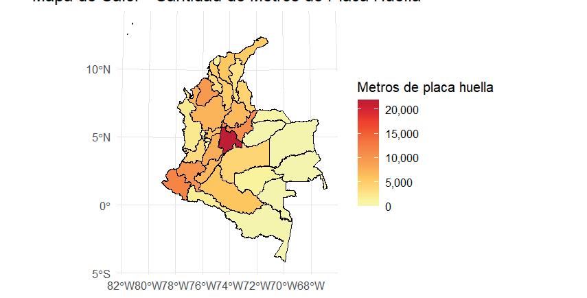 Total, el Invías ha entregado 147,1 km de placa huella. Los departamentos con mayor participación son Cundinamarca con 21,8 km, Nariño con 11,8 km, Boyacá con 10,6 km y Cauca con 10,1 km. En contraste, departamentos como Vaupés, Amazonas y Guainía no registran metros de placa huella entregados en este periodo, lo cual evidencia las brechas persistentes en acceso, logística y presencia institucional en zonas de baja conectividad y dispersión poblacional.