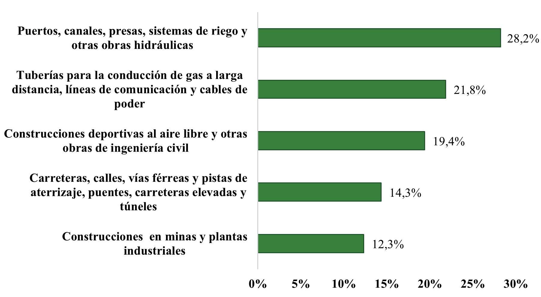 Al observar la participación de la mano de obra por tipo de proyecto de obras civiles, se evidencia que este componente presenta un peso diferenciado según la naturaleza técnica de la obra. En particular, los proyectos asociados a obras hidráulicas (como puertos, canales, presas y sistemas de riego) muestran la mayor participación relativa de la mano de obra dentro del presupuesto, seguidos por proyectos de tuberías para conducción de gas a larga distancia, líneas de comunicación y cables de poder, así como por construcciones deportivas al aire libre y otras obras de ingeniería civil. Adicionalmente, las carreteras, calles, vías férreas, pistas de