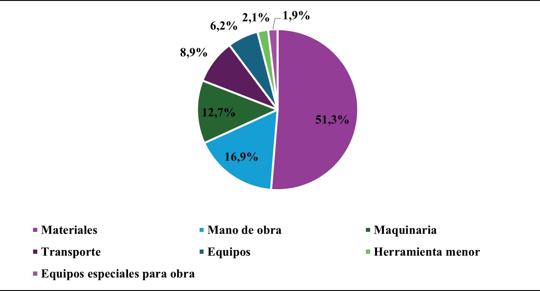 La Gráfica 1 muestra la participación relativa de los tipos de insumo dentro de un presupuesto de obra civil, construido a partir de la metodología de APU. De acuerdo con esta descomposición, los materiales concentran la mayor proporción del costo total del proyecto, con una participación superior al 50% del presupuesto, seguido por la mano de obra (16,9%), que representa el segundo componente más relevante. Este resultado es consistente con la estructura técnica de los proyectos de infraestructura, en los cuales la ejecución física de las actividades demanda una combinación intensiva de insumos materiales y trabajo, mientras que otros componentes como maquinaria, transporte, equipos y herramienta presentan participaciones relativamente menores en términos agregados.