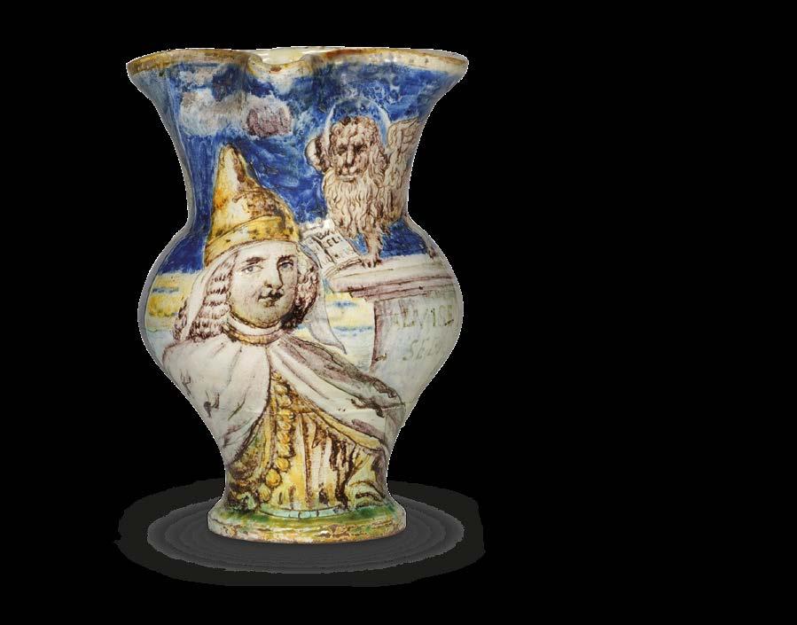 La produzione stemmata uscita dalle fornaci di Montelupo comprende vasellame da farmacia con insegne sia religiose sia laiche. A quest’ultime appartiene questo pregevole albarello, facente parte di una serie dotata della stessa insegna nobile che Fausto Berti riconosce in quello della famiglia Giraldi (“d’argento al leone rampante rosso, coronato d’oro”), databile al 1520. La fgura araldica, è campita col bel “rosso” di Montelupo ed è posta entro un anello “diamantato”, mentre tutt’attorno sono dipinti, con tutta la rara effcacia del bruno violaceo intenso di manganese, dei motivi complementari detti della foglia gotica “accartocciata” (o “alla foreale”): veste e stemma che ritroviamo in un albarello, entrato nel Museo di Faenza con la donazione Cora, e in alcuni altri albarelli1, di altezze diverse, appartenuti alla stessa spezieria, oggi dispersi in prestigiose raccolte pubbliche e private