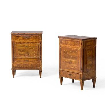 Entrambi con fronte pannellato, gambe tronconiche, montanti scanalati e piano in armo. Cassettone a tre cassetti, comodino con un cassettino e due scomparti a giorno