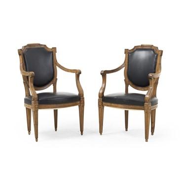 Imbottite, schienali sagomati, tappezzerie diverse. Si aggiunge nel lotto tavolo da biblioteca in stile con gambe tornite