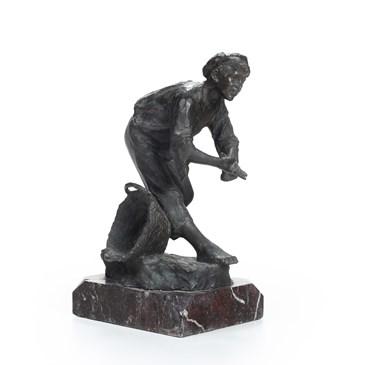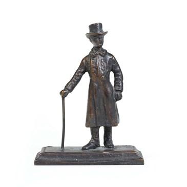 Cassa in metallo brunito e cornicette e decori dorati, sormontata da gruppo in bronzo dorato e bronzo brunito con uomo e cavallo, quadrante con numeri romani