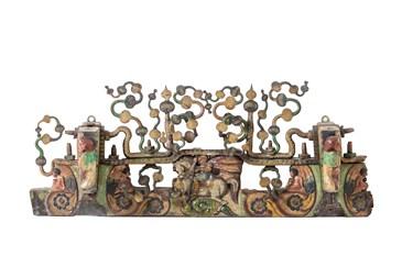 Cassa e mensola in legno dipinto con applicazioni in metallo dorato a motivi floreali e trofei. Quadrante in smalto bianco con ore in numeri romani e minuti in cifre arabe