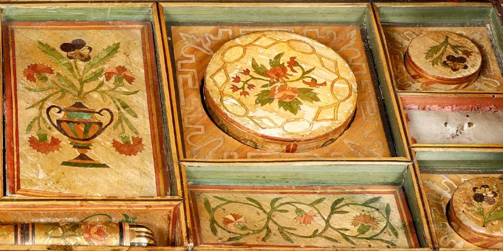 Il raro cofanetto in legno nemente dipinto con paesaggi e architetture iscritte entro cornici alla greca contiene al suo interno venticinque boccette in vetro con coperchi anellati atte a contenere pigmenti colorati per la pittura. La raf nata composizione che riveste il coperchio dello scomparto centrale interno raf gurante l’episodio mitologico di Diana e Atteone induce a rimandare la funzione dell’elegante scrigno alle arti della pittura o della miniatura