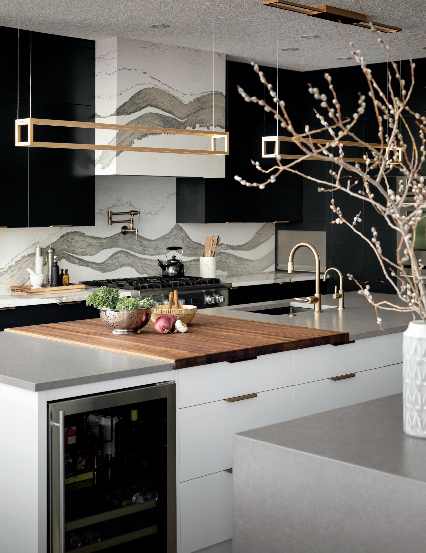 KITCHEN PG 42-43, 44, 46: Perimeter countertops and backsplash in Skara Brae by Cambria, CambriaUSA.com Island countertops in Carrick by Cambria, CambriaUSA.com. Caribou walnut butcher block from Floform, floform.com. Litze luxe gold faucets by Brizo, brizo.com. Lighting from Robinson Lighting & Bath, robinsonco.ca Cabinet hardware from Banbury Lane Design Centre, banburylane.com. Floor tile from Jullian Tile, juliantile.com