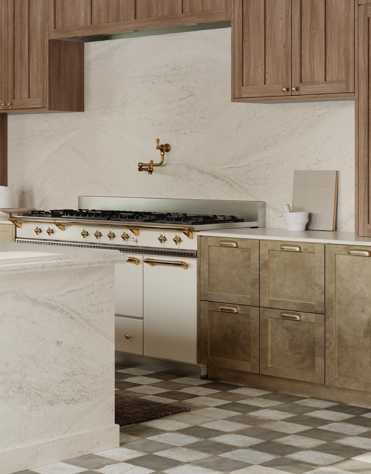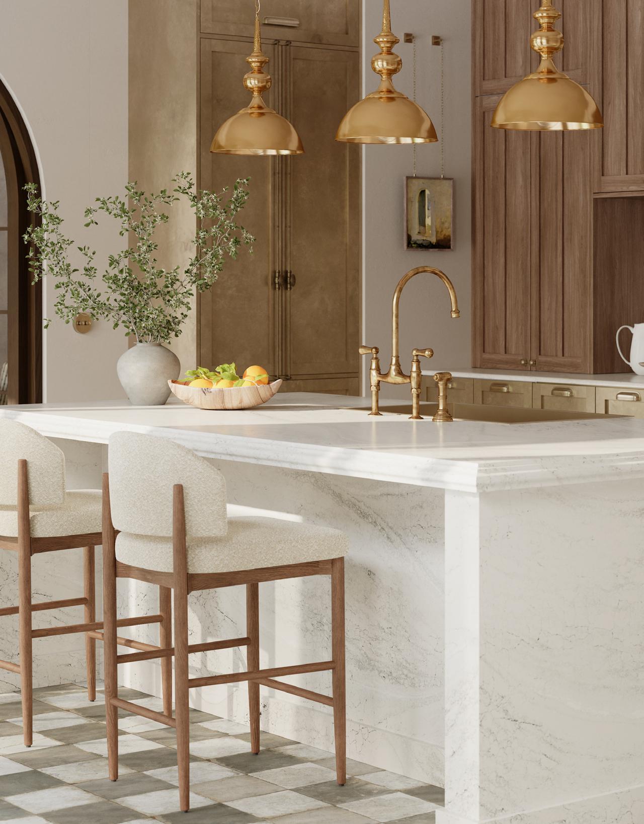 Curate a mix of natural woods, earth tones, and statement quartz countertops for a quietly luxurious style with a touch of rustic charm.