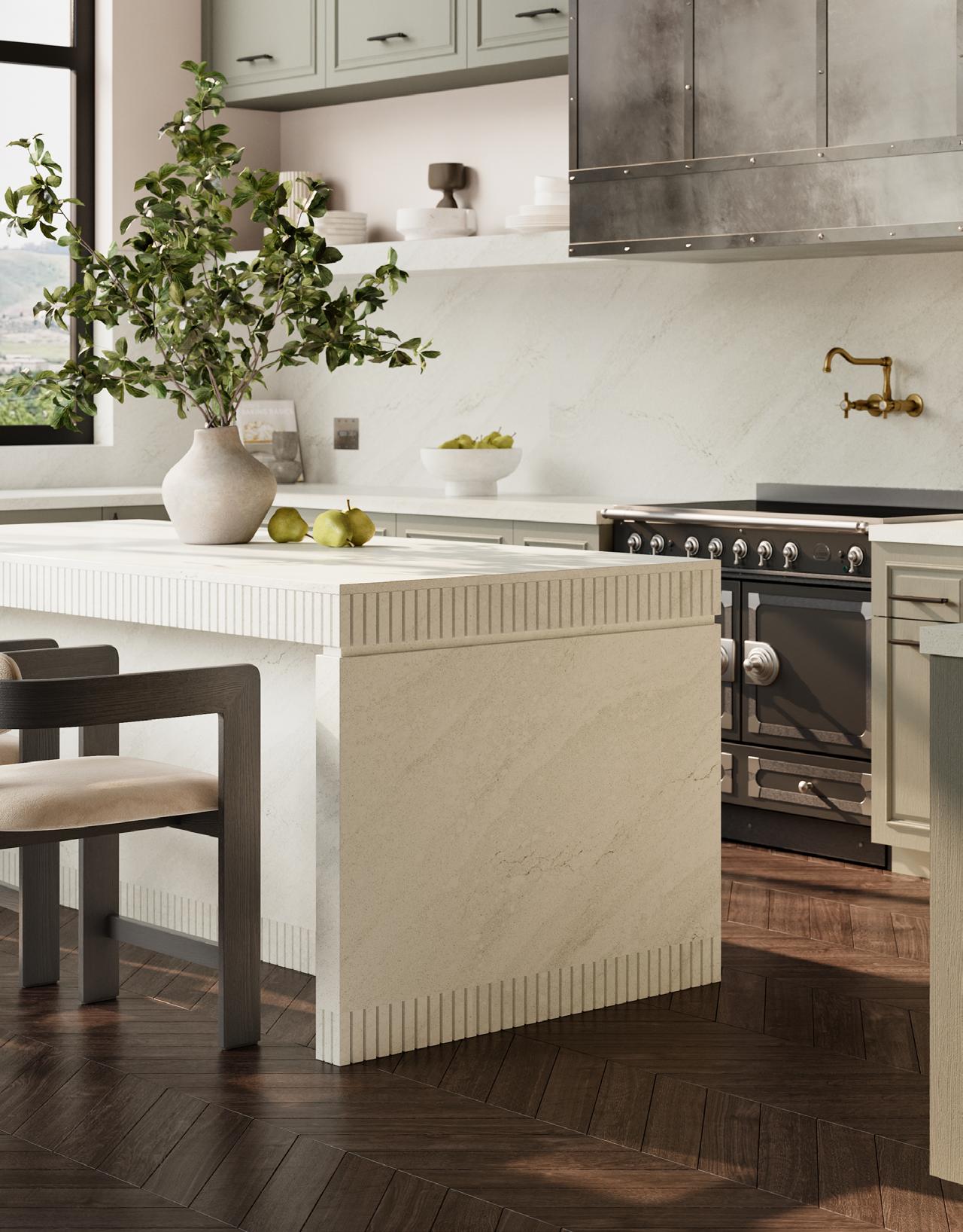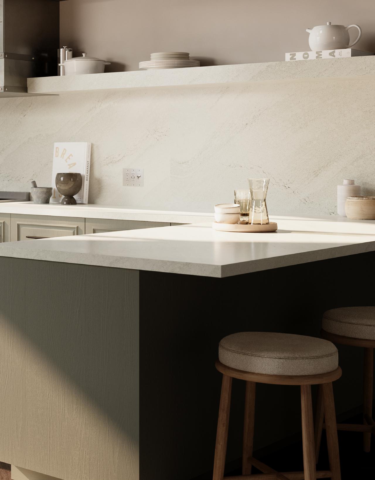Cambria’s Inverness® quartz surfaces feature gently debossed veining that contrasts against a smooth surface, creating a tactile and visually appealing experience for textured countertops and backsplashes.