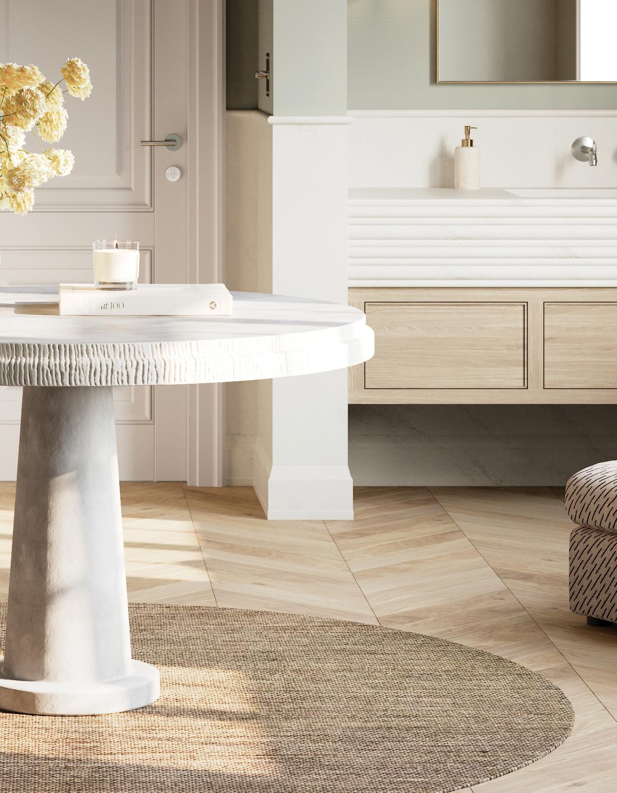 Combine finish options to soften the look of modern spaces and create a dynamic and layered aesthetic.