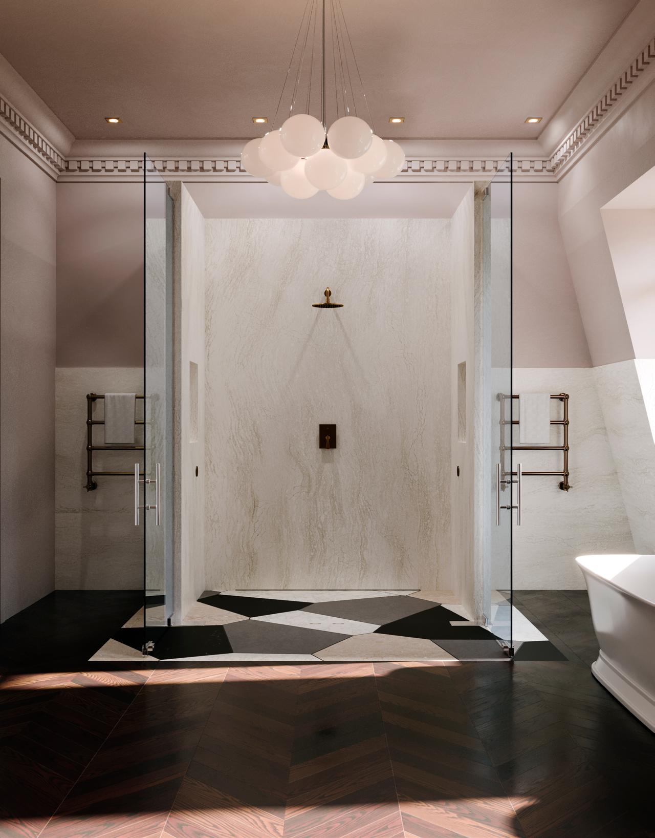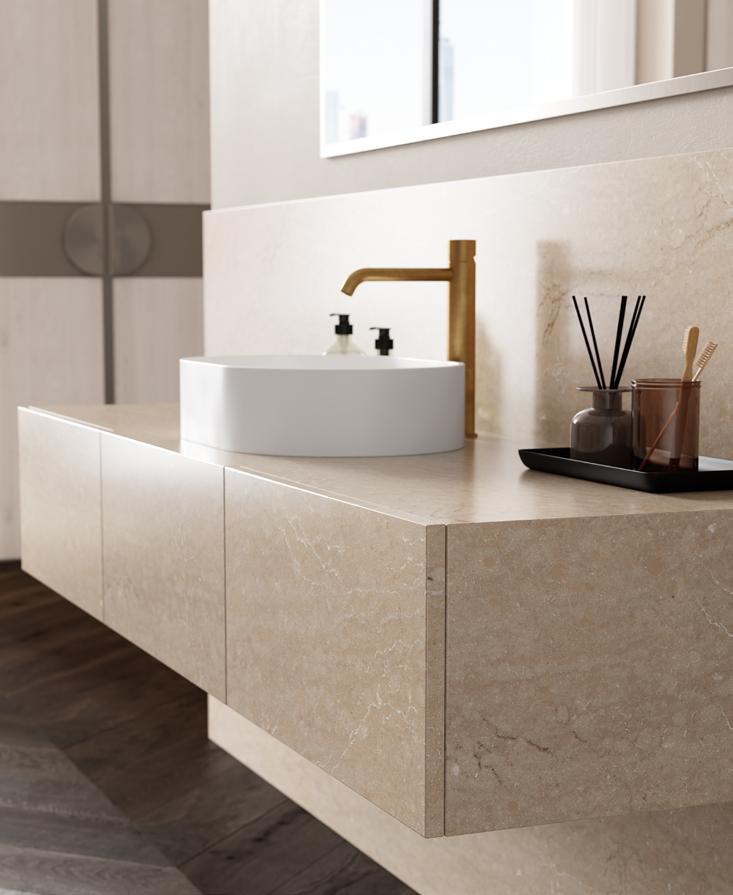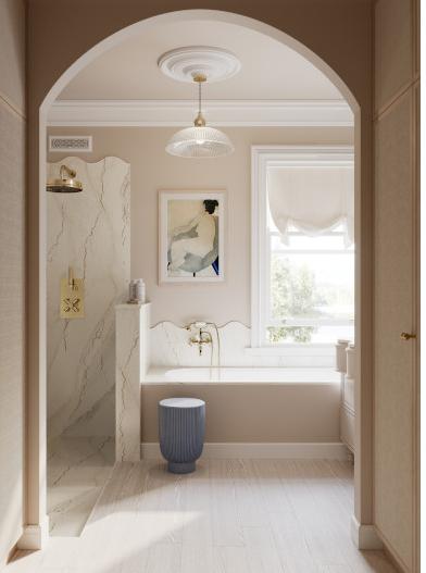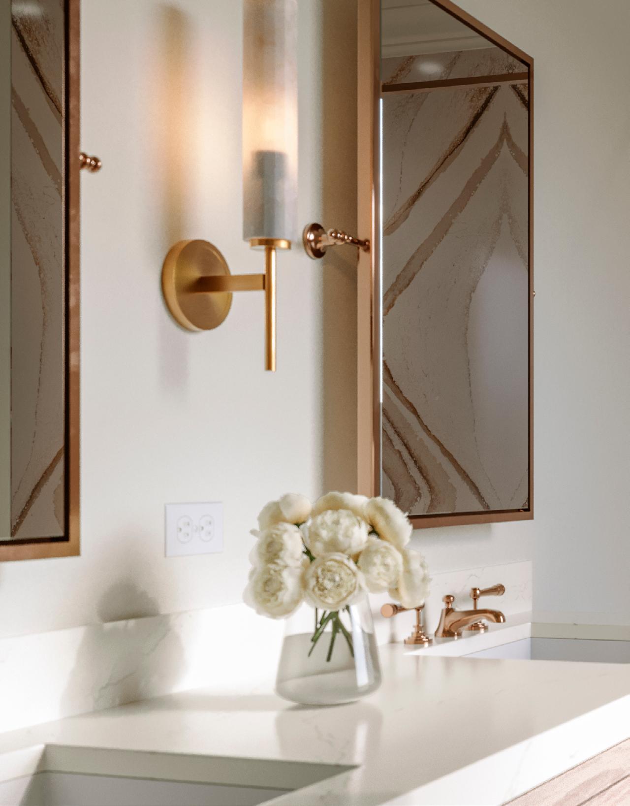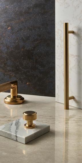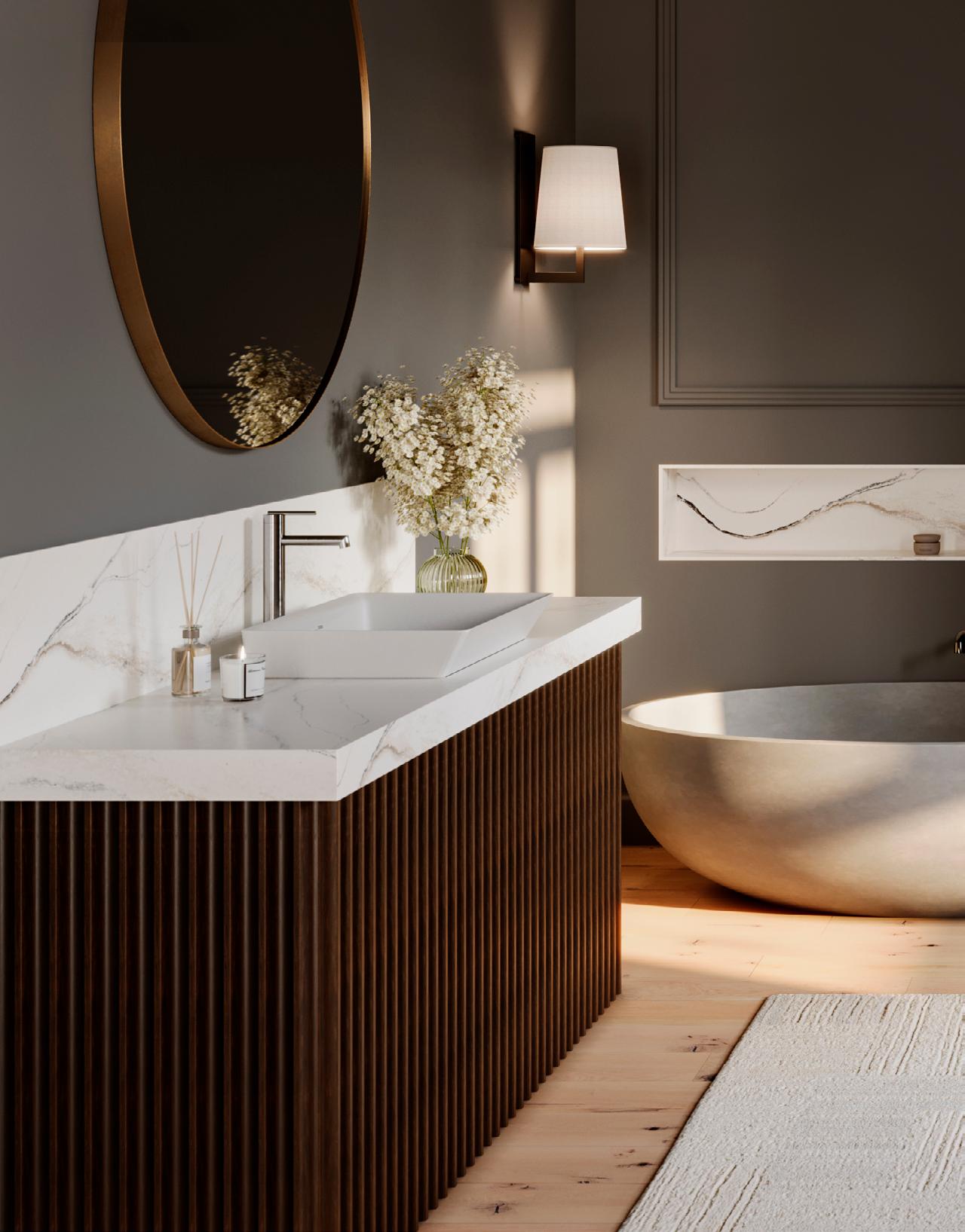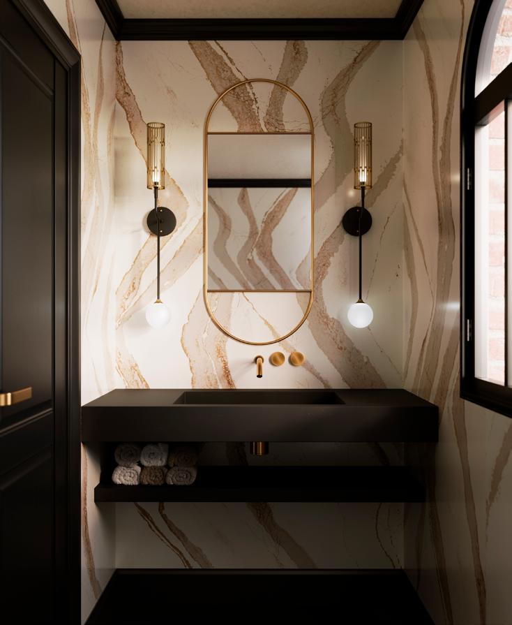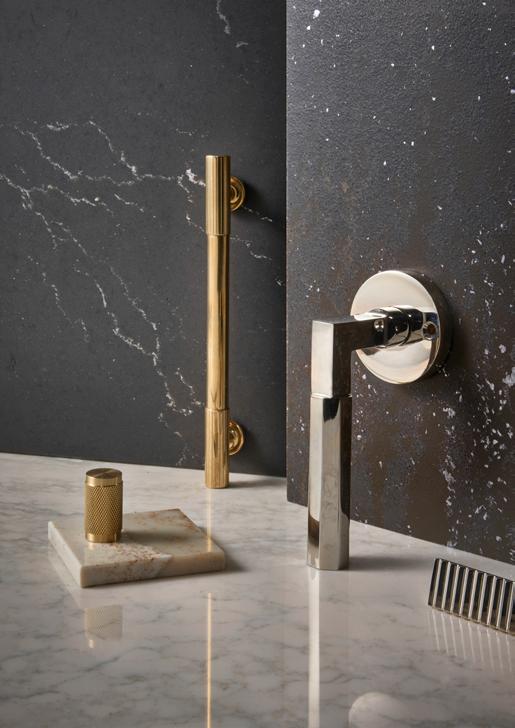 Or choose subtle drama with Cambria wave quartz designs in tone-on-tone colorways and amplify interest with geometric lighting and hardware.
