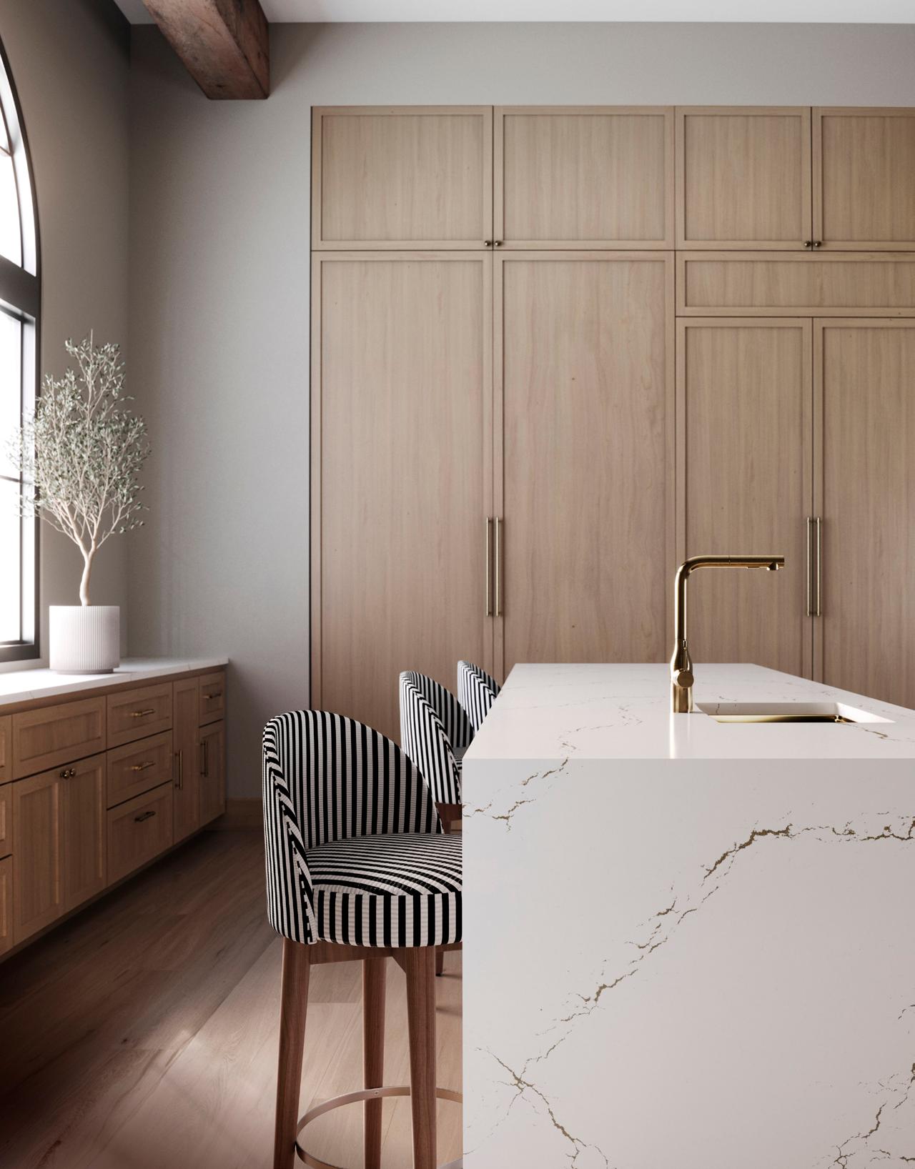 • Incorporate a mix of natural woods, mixed metals, and timeless natural quartz surfaces to create a space that’s visually diverse and appealing.