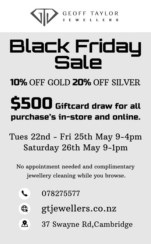 THURSDAY NOVEMBER 24, 2022 CAMBRIDGE NEWS | 1 FREE It’s a real newspaper NOVEMBER 24, 2022 docket books design • posters signs • business cards letterhead• labels newsletters • header cards • compliment slips • pull up banners raffle tickets • note pads • large format printing 07 827 6269 info@printech.net.nz 12 Carters Cres, Cambridge www.printech.net.nz Your local ONE STOP PRINT SHOP 07 827 6037 3 Hallys Lane, Cambridge office@grinters.co.nz www.grinters.co.nz Celebrating Life - Your Way Jim Goddin JP Funeral Director Follow us on Facebook Grinter’s Funeral Home are dedicated to providing personalised and meaningful funeral services, as unique as the life you are celebrating. Love your smile. Visit your friendly community dentist at Leamington Dental. Open 5 days a week. • Exam and X-rays • Hygiene Services • General Dentistry • Cosmetic Dentistry Payment Options • ACC Registered Book today on 07 823 4665 or online lumino.co.nz Book today! leamington dental 50 Victoria Steet Cambridge 07-8276455 sportsworld.co.nz Your Home Of Sporting For This Christmas