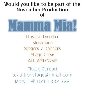 On-Stage Te Kūiti has put out a call to people who would like to be involved with its planned production of Mamma Mia. OnStage is celebrating its 70th anniversary and will host a reunion in October.