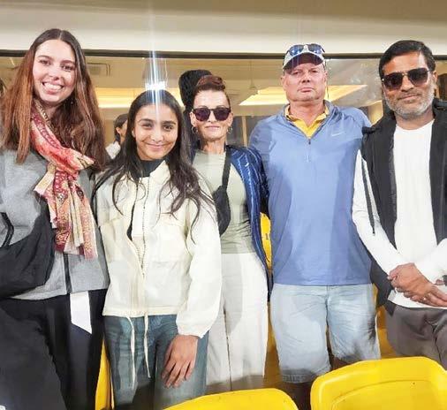 Kristian’s girlfriend Jess Johnson (left) and mum and dad Jan and Peter Clarke pose with fans at his debut match in India.