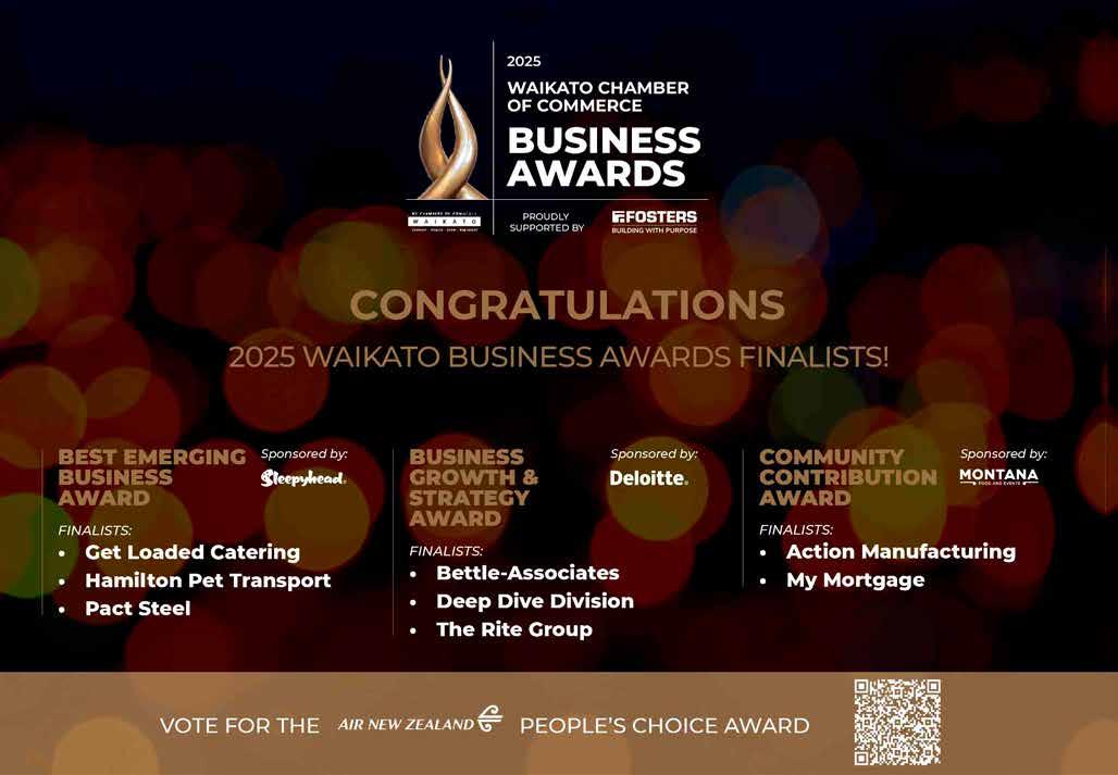 The finalists for the 2025 Waikato Business Awards, supported by Fosters, have been announced. Anticipation is now building for the Gala Dinner on Friday, 21 November. On the night, winners across eleven business categories will be revealed, along with the distinguished titles of Emerging Leader, CEO of the Year, and the Supreme Business of the Year.
