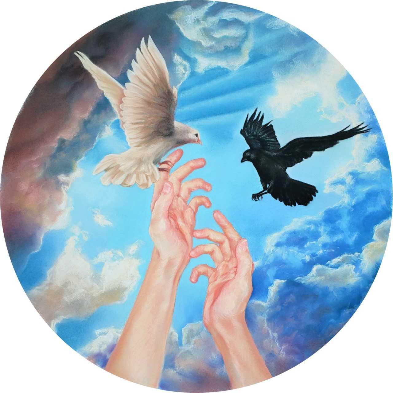 Birds carry heavenly themes as they fly through the sky. The vast openness of the heavens in this image helps to support that idea along with the encompassing and continuous nature of the circular picture plane. The symbolism of each bird in this composition contrasts in theme as much as their physical appearance. The dove, elevated in the image, stands for peace, life, and often represents the Holy Spirit in the Bible and Christian iconography. The raven in the distance acts as a symbol or bringer of death. It can be seen that the hands emerging from the bottom are outstretched, the left index finger making contact with the dove. This shows the individual’s decision to choose life over death.