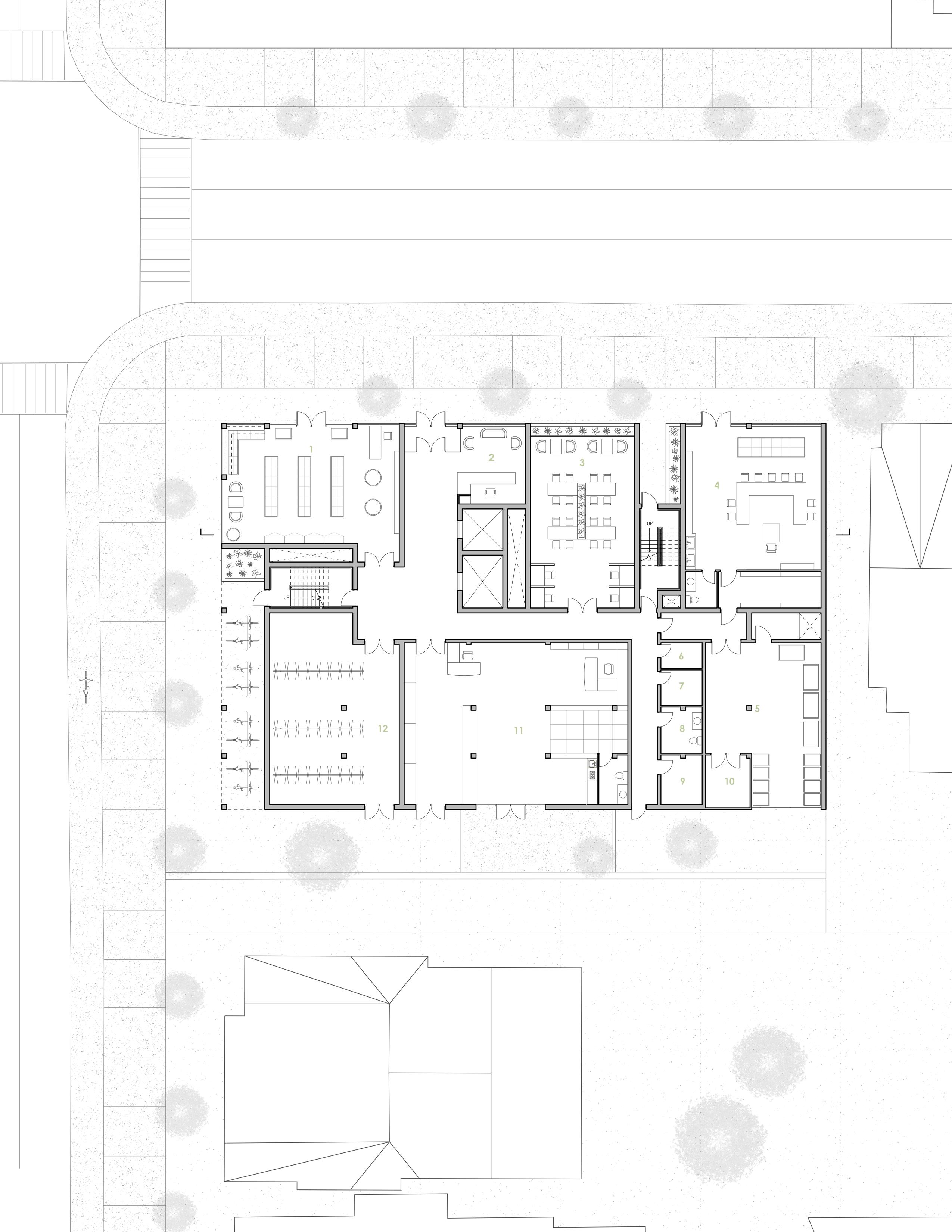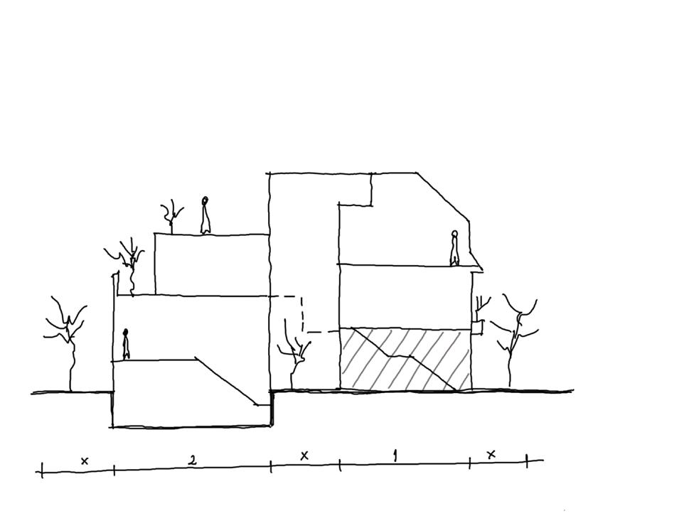 The project aims to develop two housing units that blend into Oskenonton Lane and provide a bookstore for the neighbourhood. The main idea to connect both dwellings was to use half levels to generate a fit between them in section and optimize the vertical circulation space.