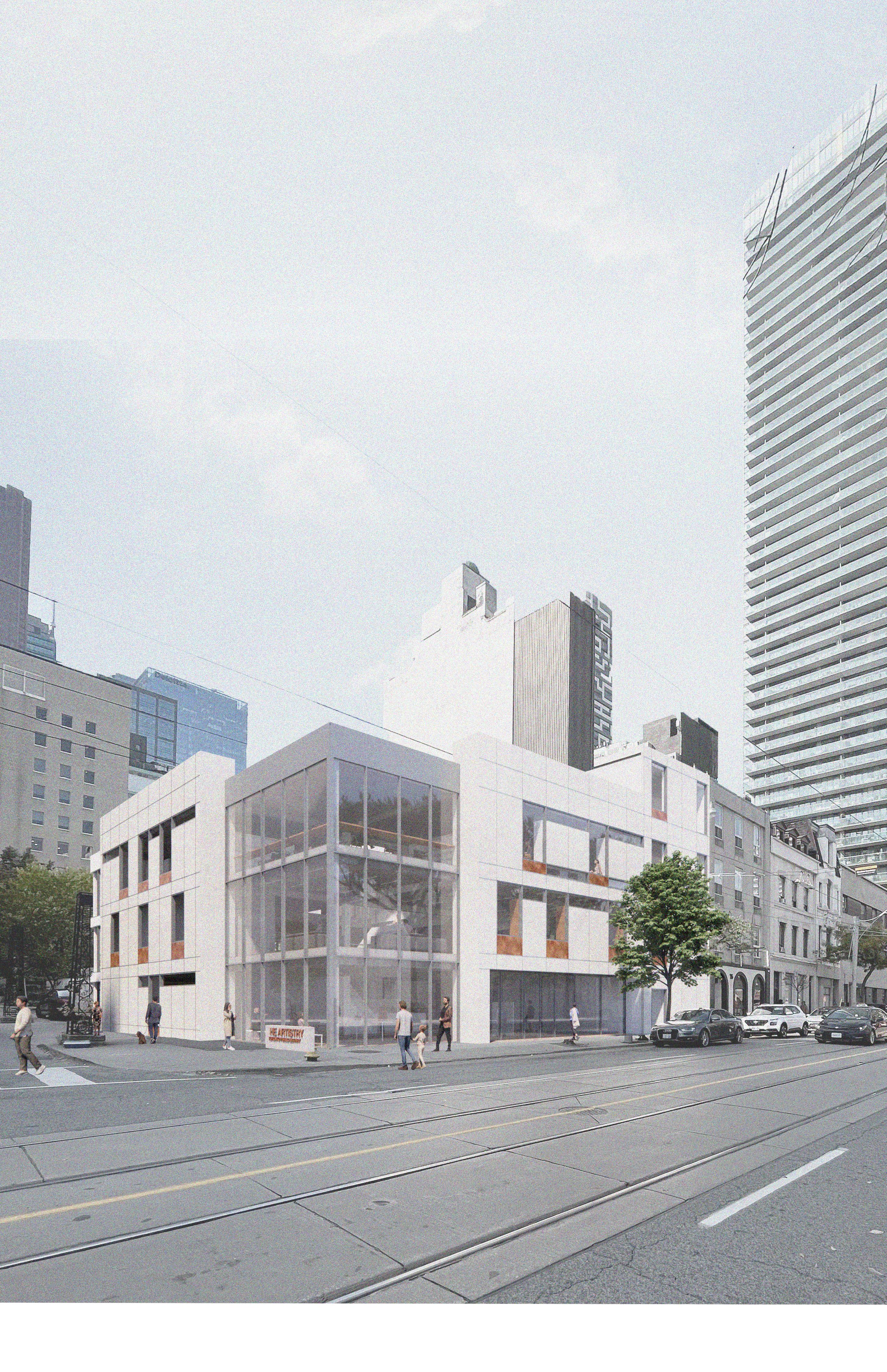 The community library was designed to engage with the landscaped views of Court Square Park and St. James Park, creating a dialogue with the monumental buildings from the Historic District of Toronto. The project envisions a reading space that connects green spaces and frames views of the Cathedral of St. James.