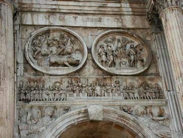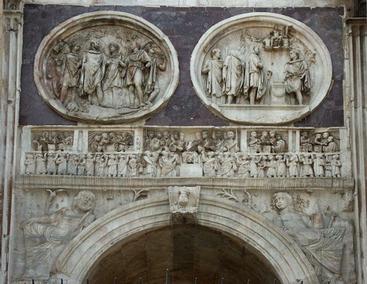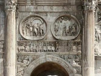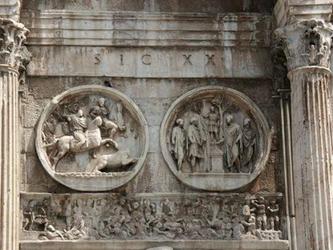 O Arco de Constantino (fig 20) foi construído para comemorar a vitória do imperador Constantino (reinado de 306 –337) sobre Maxêncio na Batalha da Ponte Mílvia em 312 Está localizado entre o Coliseu e o monte Palatino, e sob a via triunfal.